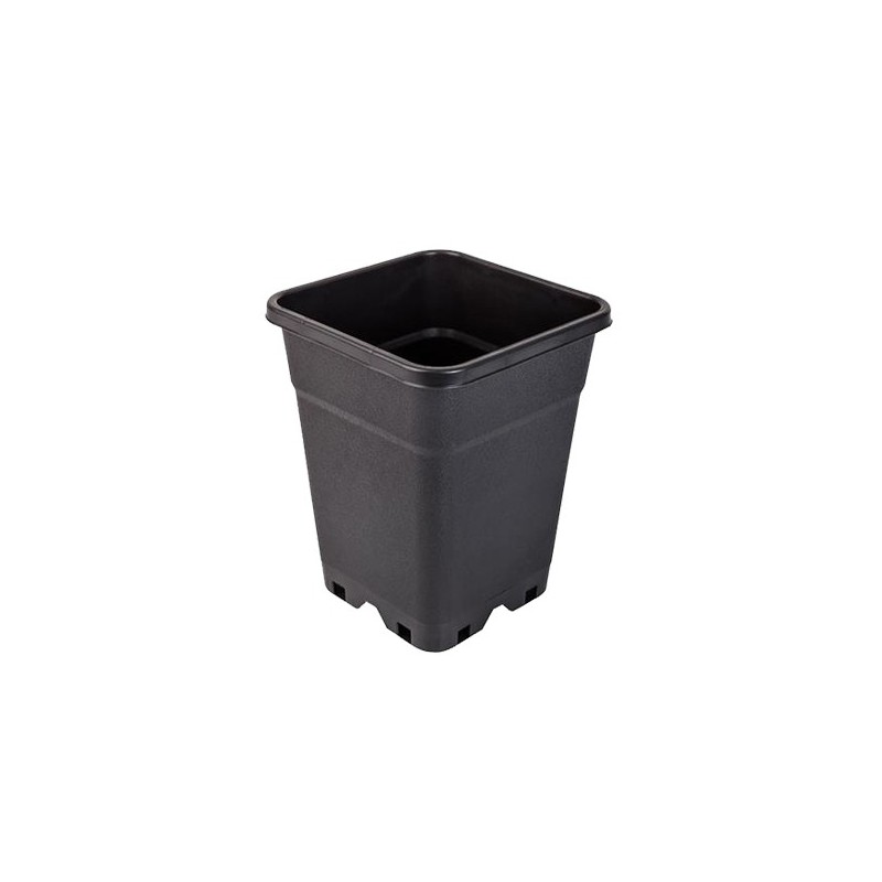 Maceta cuadrada con orificios en la base. Son económicas hechas de un plástico resistente y se pueden reutilizar.
