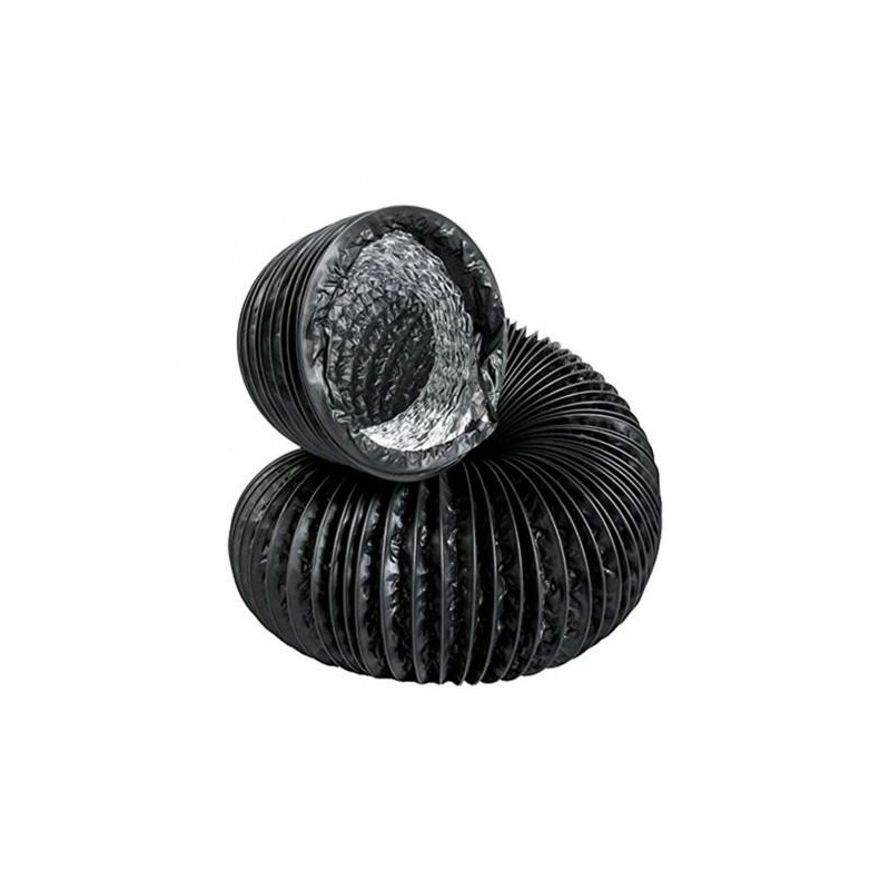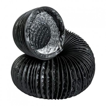 Su estructura interna de aluminio de alta calidad permite una conducción eficiente del aire, mientras que su capa exterior de PVC negro anticondensante evita la acumulación de humedad causada por la diferencia de temperaturas entre el interior y el exterior del ducto.